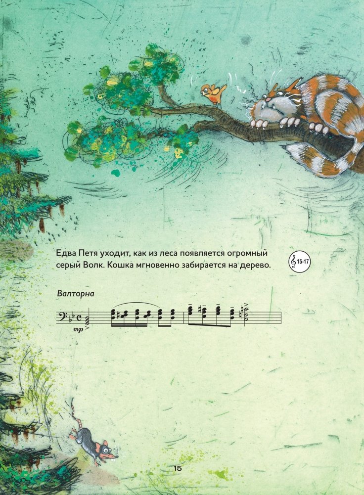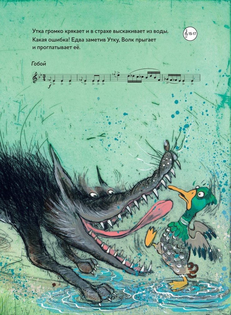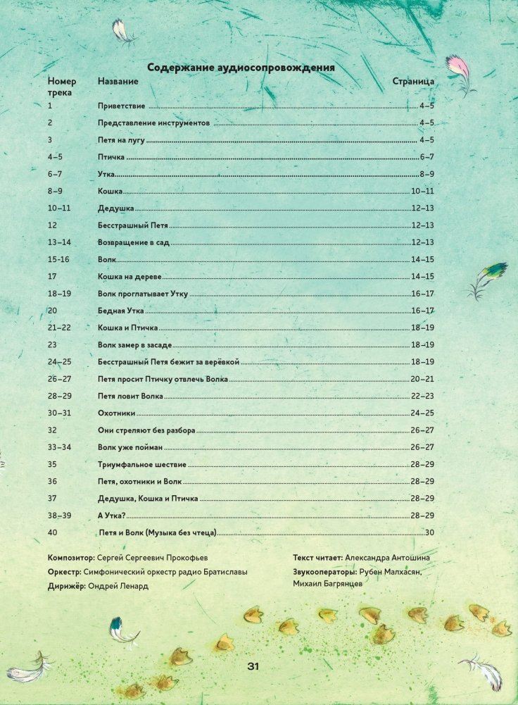 Каждый персонаж сказки представлен определённым инструментом и отдельным мотивом. Чтобы познакомиться с партией каждого героя, прослушайте аудиозапись и попробуйте сыграть приведённые в книге ноты на своём любимом музыкальном инструменте!