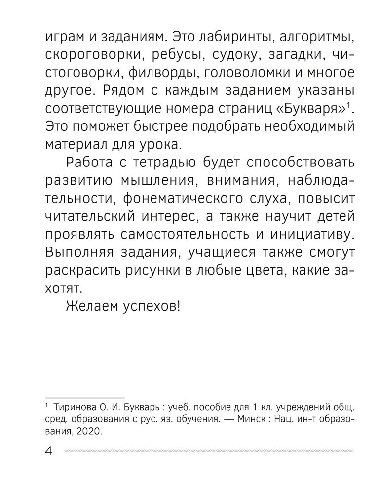 Пособие предлагает новый подход к обучению грамоте, предусматривающий тесную взаимосвязь учебной и игровой деятельности. Увлекательные задания (лабиринты, головоломки, судоку, филворды и др.) помогут первоклассникам усовершенствовать навыки чтения, развить мышление, внимание, наблюдательность, фонематический слух. Материал тетради дополняет учебное пособие «Букварь» (автор О. И. Тиринова).