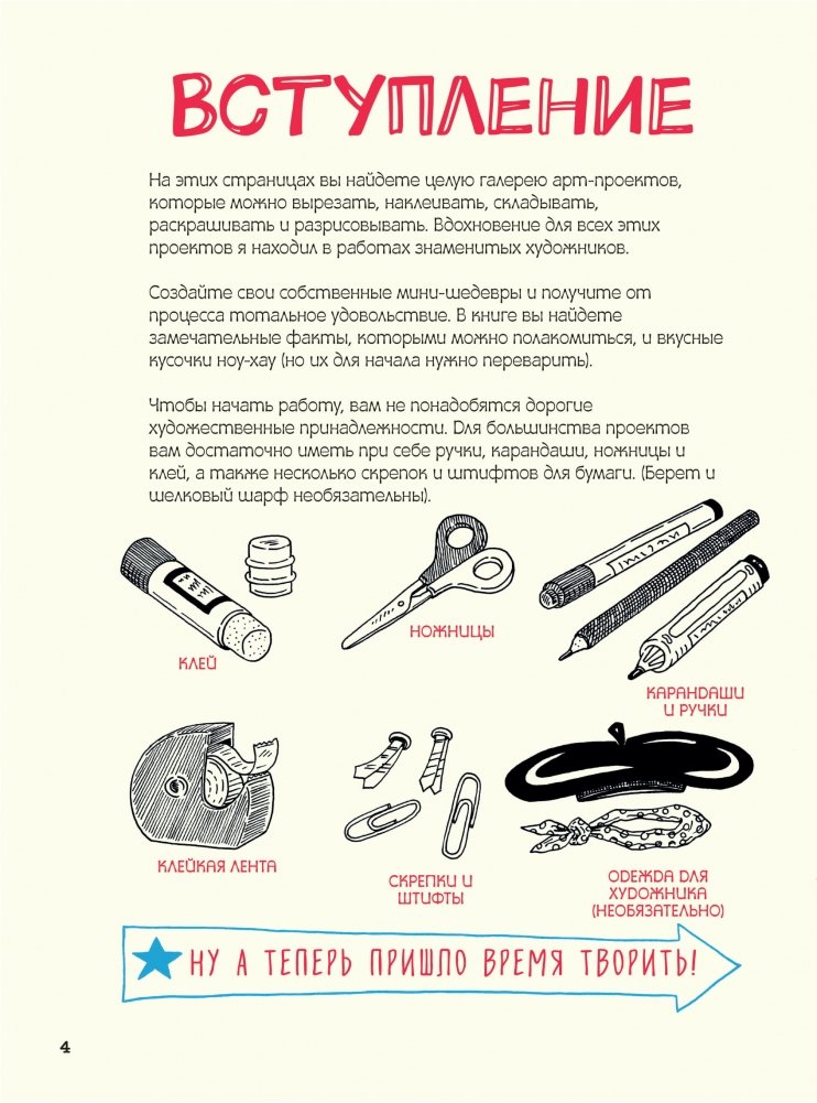 Открой для себя новый подход к изучению искусства! Внутри этой книги ты найдешь более 20 арт-проектов, которые необходимо вырезать из бумаги, склеить и раскрасить. Узнай интересные факты о живописи и великих художниках, об их техниках и самых знаменитых шедеврах и попробуй создать свои собственные произведения искусства! Заставь шедевры наскальной живописи двигаться, раскрась картины Мунка и Ван Гога, вырежи бумажную фигурку Фриды Кало, создай собственного карманного Пикассо – и получи удовольствие не только от познания нового, но и от созидания! Не окунайся в искусство, стань его частью!