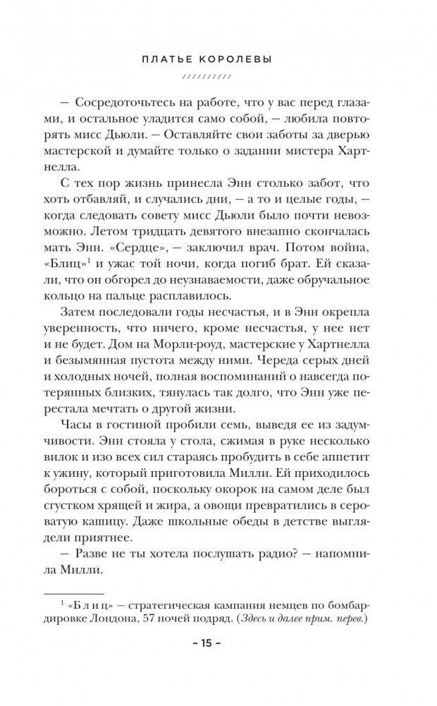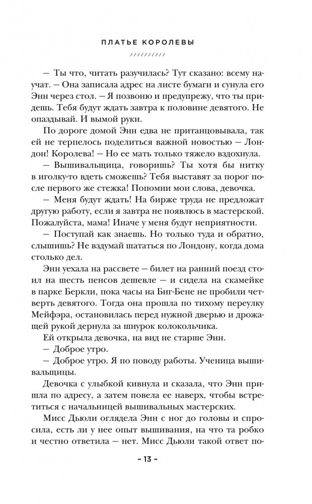 Увлекательный исторический роман об одном из самых известных свадебных платьев двадцатого века — платье королевы Елизаветы — и о талантливых женщинах, что воплотили ее прекрасную мечту в реальность. Лучший исторический роман года по версии USA Today и Real Simple! Более 30 000 читателей оценили книгу на «отлично» на международном книжном портале Goodreads.com. «Замечательный роман, особенно для поклонников сериалов в духе «Корона» [исторический телесериал, выходящий на Netflix, обладатель премии «Золотой глобус»]. Книга — интимная драма, которая, несомненно, вызовет интерес». — The Washington Post «Лучший исторический роман года». — A Real Simple