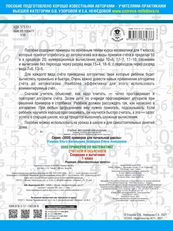 Пособие содержит примеры по основным темам курса математики для 1 класса, которые помогут отработать до автоматизма все виды приемов счёта в пределах 10 и в пределах 20: нумерационные вычисления вида 10+6, 17-7, 17-10, сложение и вычитание без перехода через разряд вида 15+4, 18–6; с переходом через разряд вида 7+6, 13–5.