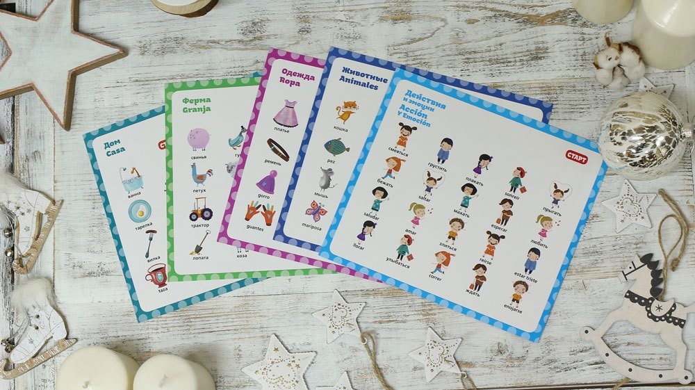 Интерактивная голосовая книга для изучения испанского языка «Мой первый испанский». Первые 100 испанских слов малыш сможет выучить, находя одинаковые изображения. Одно из изображений озвучено на русском языке, другое — на испанском. Нажимая на рисунки и повторяя услышанное, ребёнок запоминает слова на испанском языке.