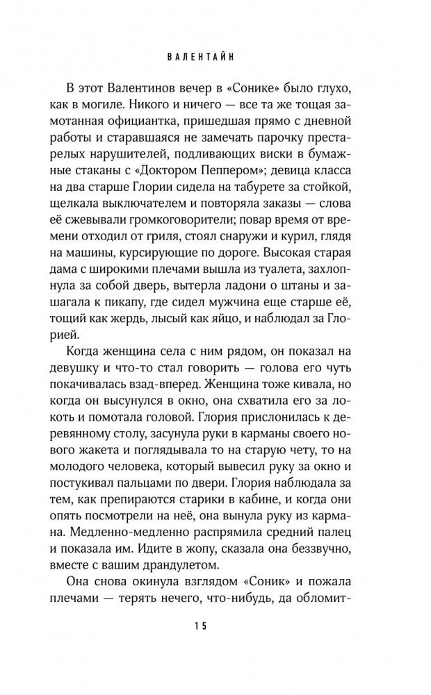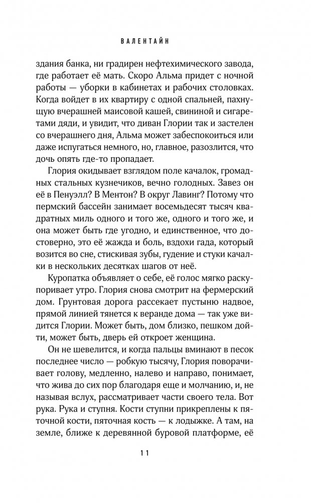Какова судьба женщин в мире, который принадлежит мужчинам? И насколько тяжело поднять голову и начать наконец бороться за справедливость? Об этом роман Элизабет Уэтмор "Валентайн" — роман невероятной силы, мощный и праведно яростный. Америка, 70-е годы. Нефтяной бум проносится по Техасу, подобно торнадо, обещая мужчинам невиданные доселе богатства. Женщинам он сулит лишь отупевших от нежданной прибыли и беспробудного пьянства мужчин. Утром после Дня святого Валентина четырнадцатилетняя Глория Рамирес появляется на пороге фермы Мэри Роз — избитая, напуганная, умоляющая о помощи. Весть о том, что ее изнасиловал белый нефтяник быстро разносится по маленькому городку, но мало кто верит словам Глори.