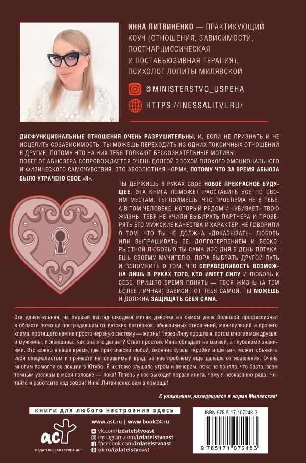Ты держишь в руках свое новое прекрасное будущее. Эта книга поможет расставить все по своим местам. Ты поймешь, что проблема не в тебе, а в том человеке, который рядом и «убивает» твою жизнь. Тебя не учили выбирать партнера и проверять его мужские качества и характер. Не говорили о том, что ты не должна «доказывать» любовь или выпрашивать ее. Долготерпением и бескорыстной любовью ты сама изо дня в день потакаешь своему мучителю. Пора выбрать другой путь и вспомнить о том, что справедливость возможна лишь в руках того, кто имеет силу и любовь к себе. Пришло время понять — твоя жизнь (а тем более личная) зависит от тебя самой. Ты можешь и должна защищать себя сама.