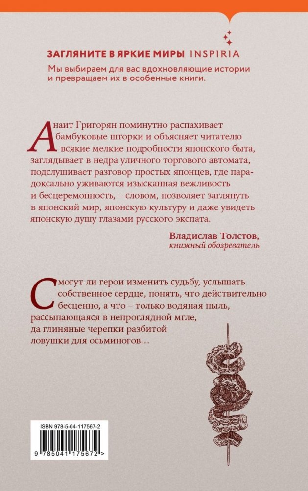 На маленьком рыбацком острове Химакадзима, затерянном в заливе Микава, жизнь течет размеренно и скучно. Туристы здесь – редкость, достопримечательностей немного, зато местного колорита – хоть отбавляй. В этот непривычный, удивительный для иностранца быт погружается с головой молодой человек из России. Правда, скучать ему не придется – ведь на остров приходит сезон тайфунов. Что подготовили героям божества, загадочные ками-сама, правдивы ли пугающие легенды, что рассказывают местные рыбаки, и действительно ли на Химакадзиму надвигается страшное цунами? Смогут ли герои изменить судьбу, услышать собственное сердце, понять, что – действительно бесценно, а что – только водяная пыль, рассыпающаяся в непроглядной мгле, да глиняные черепки разбитой ловушки для осьминогов…