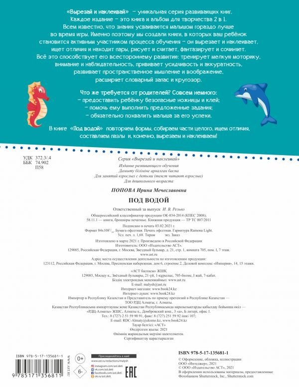 В книге "Под водой" повторяем формы, собираем части целого, ищем отличия, составляем пазлы и, конечно, вырезаем и наклеиваем!