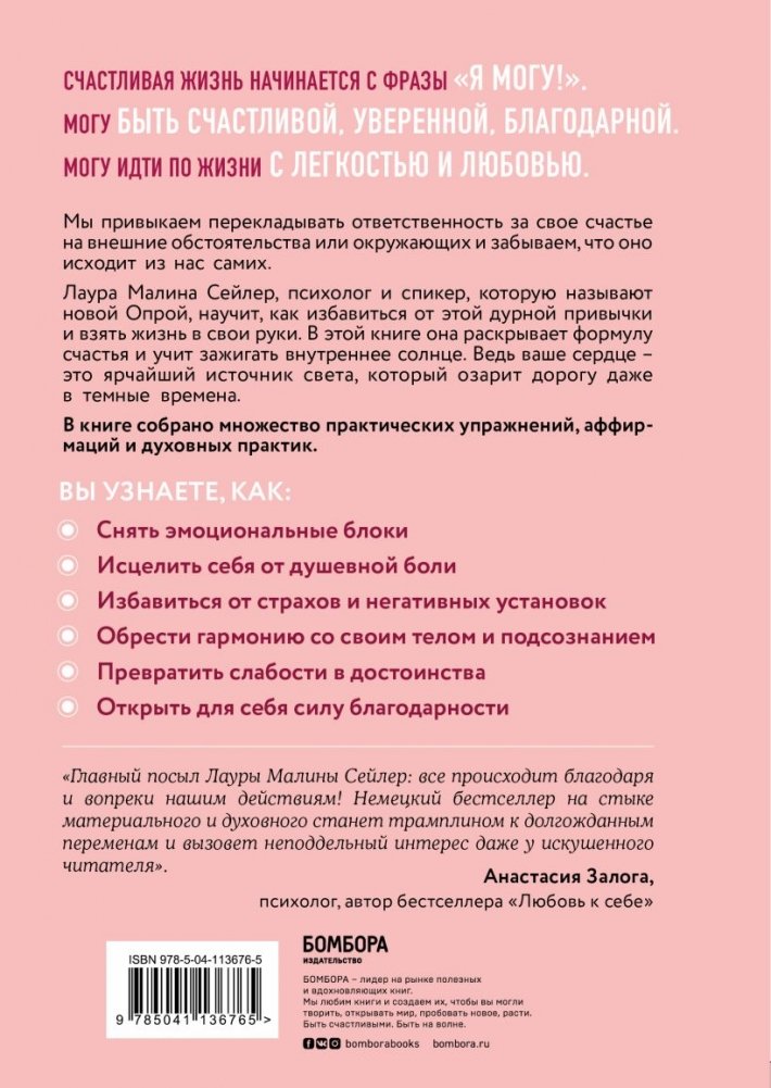 Счастливая жизнь начинается с фразы: "Я могу!" Могу быть счастливой, уверенной, благодарной. Могу идти по жизни с легкостью и любовью. Мы привыкаем перекладывать ответственность за свое счастье на внешние обстоятельства или окружающих и забываем, что оно исходит из нас самих. Лаура Малина Зайлер, психолог и спикер, которую называют новой Опрой, научит, как избавиться от этой дурной привычки и взять жизнь в свои руки. В этой книге она раскрывает формулу счастья и учит зажигать внутреннее солнце. Ведь ваше сердце – это ярчайший источник света, который озарит дорогу даже в темные времена.