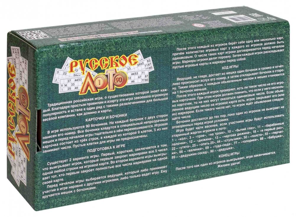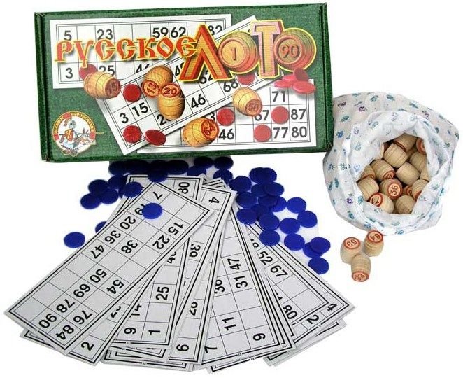 Настольная игра "Русское лото" включает в себя 24 карточки, разделенные на клетки. Специальные пронумерованные бочонки, выполненные из дерева, нужно перемешать в мешке и, вытаскивая не глядя, собрать на своем поле указанные числа.