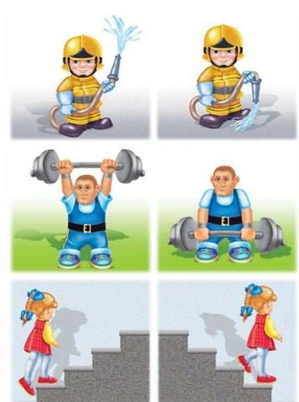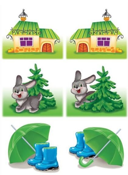 Разрежьте карточки по пунктирным линиям и предложите ребенку найти пары. Например: на одной карточке котенок сидит перед домом, на второй – за домом. Объясните, в чем различие изображений, используя предлоги и наречия, которые указывают на положение в пространстве. Пусть ребенок повторяет эти слова и уже сам объясняет вам, как расположены предметы на рисунке.