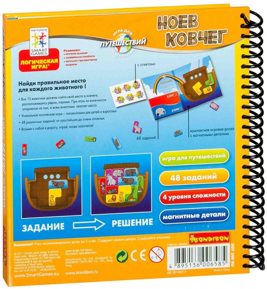 Поверхность игры «Ноев ковчег»– это замечательное «поле действий» для маленького исследователя, компактная игровая доска с магнитными деталями. Содержит 48 заданий и 4 уровня сложности для детей от 5 лет и взрослых.