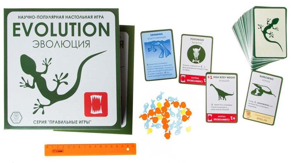 В игре "Эволюция" игрокам предлагается самим комбинировать различные свойства животных и развивать собственную популяцию в условиях постоянно меняющегося количества ресурсов - еды. Регулируя численность животных, получая новые, полезные свойства и противодействуя соперникам, популяция игрока должна выжить и к концу игры занять доминирующее положение в экосистеме.