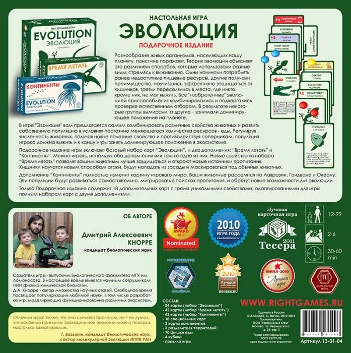Подарочный набор "Эволюции" - отличный повод познакомиться с этой замечательной игрой и прекрасное пополнение вашей настольной коллекции. Желаем всем игрокам удачи в нелёгком деле развития жизни на Земле!