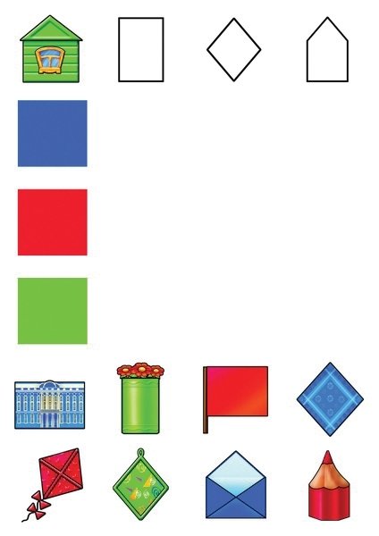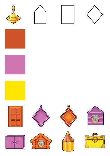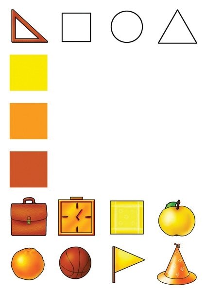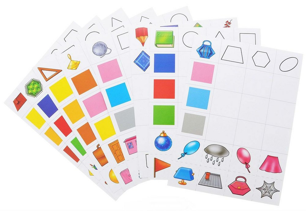 Настольная игра предназначена для ребенка старшего дошкольного возраста, при помощи которой малыш не только сможет повторить геометрические фигуры, цвета и оттенки, но и развить зрительное восприятие, произвольное внимание, память и логическое мышление. Перед началом игры разрежьте карты по пунктирным линиям. У вас получится 8 карт с таблицами и 72 карточки с предметами. Раздайте детям карты с таблицами поровну, затем поочередно показывайте карточки с картинками. Те дети, кому предметы подходят по цвету и по форме, берут их себе и выкладывают на подходящую клетку таблицы. Выигрывает тот, кто правильно и быстрее других заполнит свои таблицы.