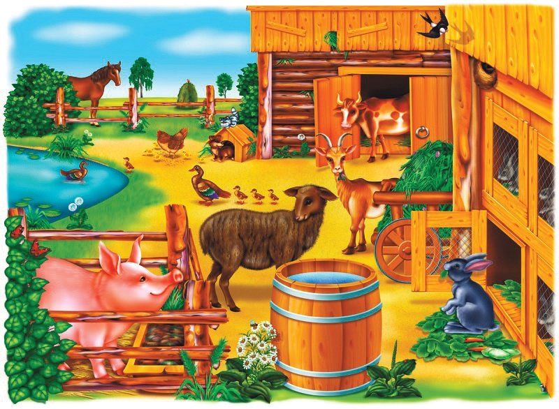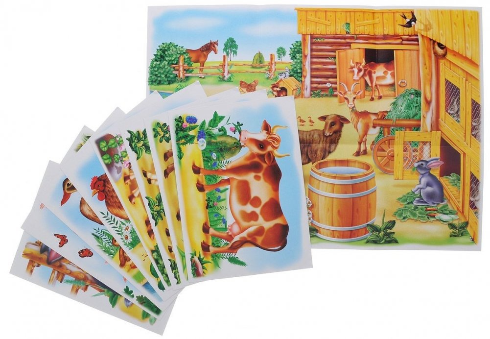 Состав набора: 8 карточек с животными, изображение сельского двора.