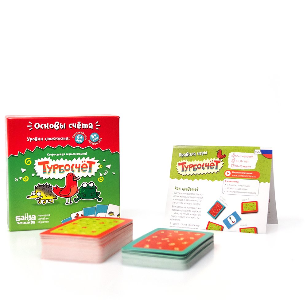 Настольная игра "Турбосчёт" - весёлая и очень динамичная обучающая игра, которая мгновенно увлекает и детей, и взрослых. Правила очень просты и усваиваются буквально за минуту - но при этом игра даёт массу полезного для обучения математике. В "Турбосчёте" есть несколько уровней сложности: игра будет очень полезна и для дошкольников, которые только-только запомнили названия чисел, и для учеников младших классов, осваивающих арифметические действия.