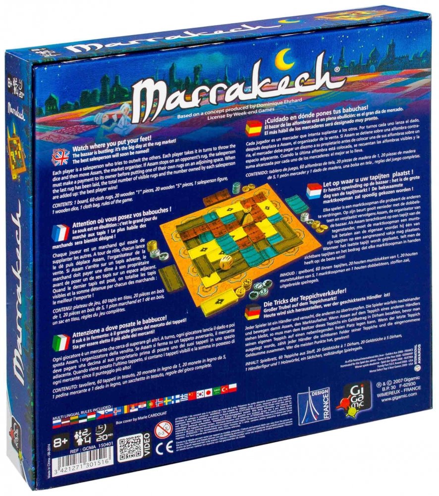 Ковровый рынок Марракеш бурлит: вот-вот будет объявлен лучший продавец! Каждый игрок хочет добиться, чтобы в конце игры было видно максимальное количество его ковров, и в то же самое время старается получить наибольшую прибыль. Это красивая и несложная игра, больше тактическая, чем стратегическая, которая отлично подойдёт для семейной компании. Очень красивая, с симпатичными ткаными ковриками и активным взаимодействием между игроками – скучать вам точно не придётся!