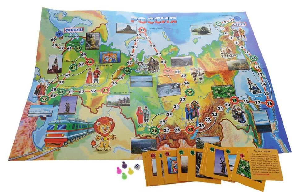 Игра в занимательной форме расскажет ребенку о родной стране. Внимание привлекут карточки с интересной информацией и заданиями, выполняя которые, игроки совершат увлекательное путешествие по игровому полю. Наша Россия - самая большая страна в мире. Какая гора в России выше всех других? Где находится самое глубокое озеро? Чем знаменит полуостров Камчатка? Где живёт Дед Мороз? Все это интересно узнать и детям, и взрослым.