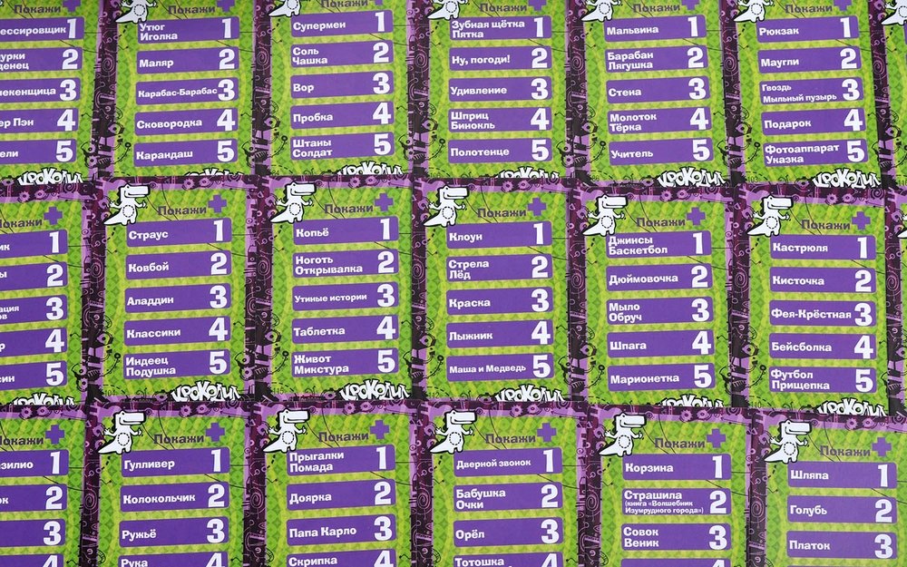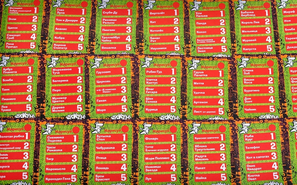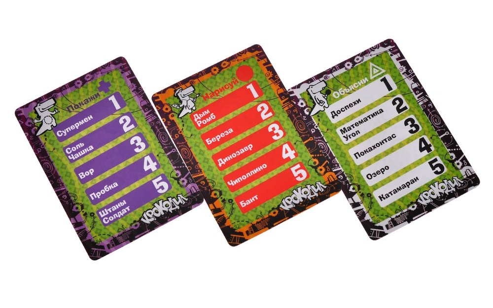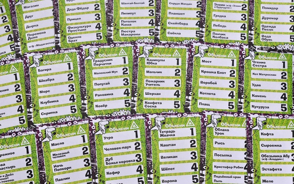 В игре 81 карта с заданиями, на каждой — по пять слов или словосочетаний. Карты «покажи» — соответственно, на показ жестами; «нарисуй» — вы пробуете нарисовать слово за минуту, а «объясни» — объясняете синонимами.