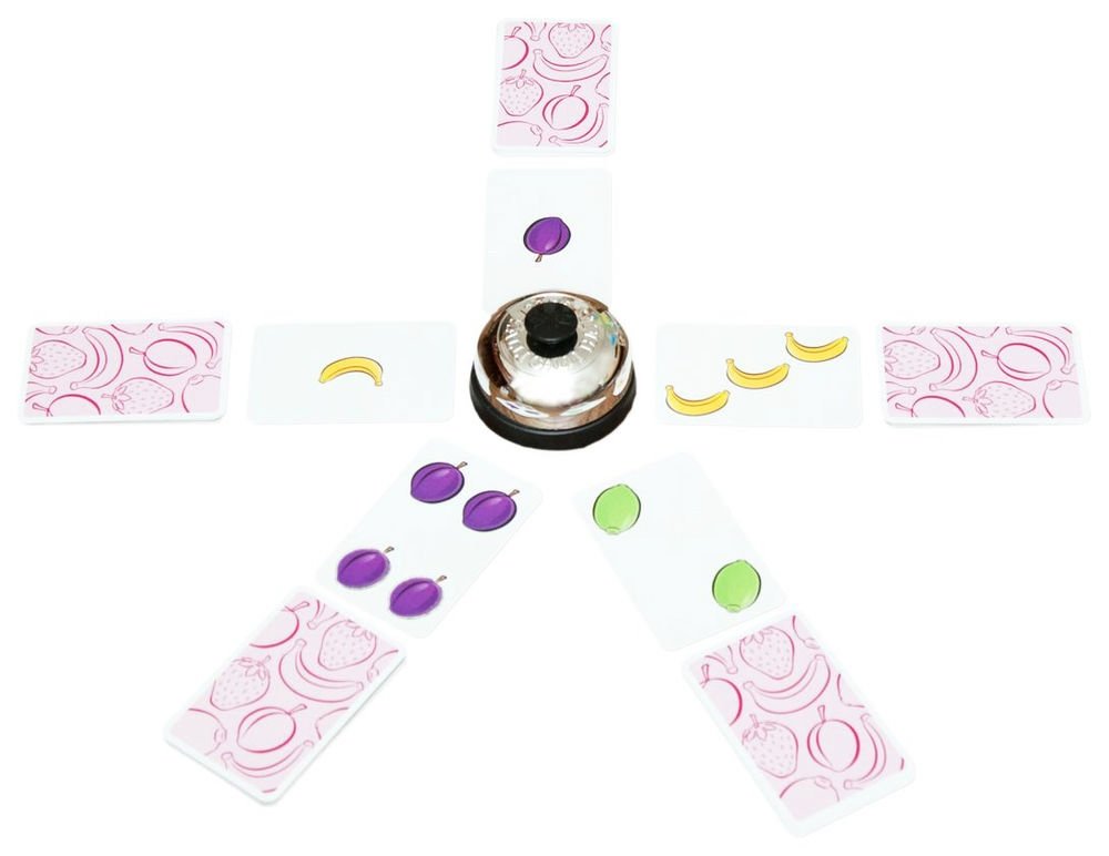Состав игры: 56 карт с изображениями одного их четырёх видов фруктов (банан, клубника, лайм, слива в количестве от 1 до 5), звонок, правила игры на русском языке внутри, жестяная коробочка.