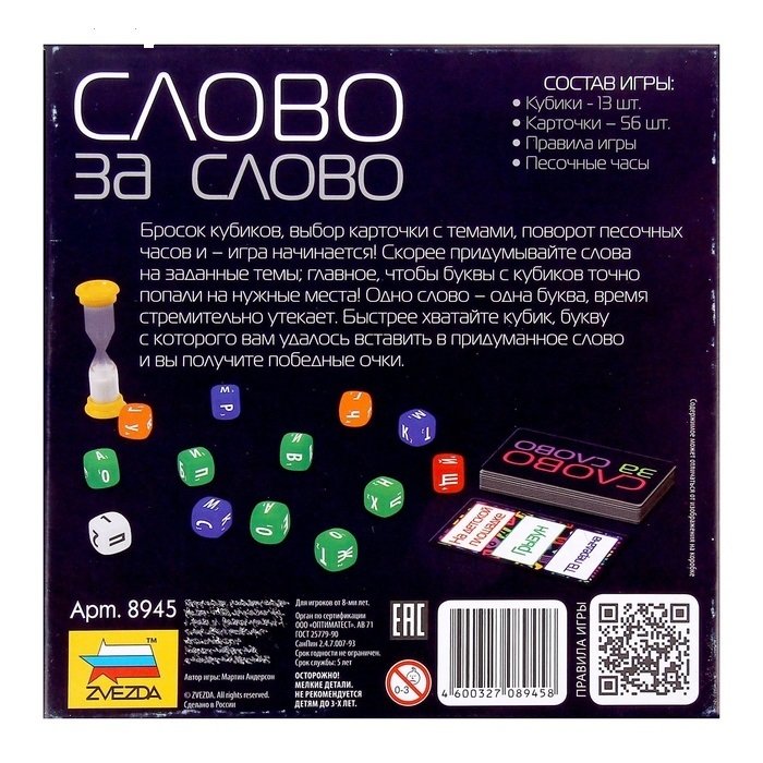 Слово за слово - это динамичная и оригинальная игра в слова, которую мы вам спешим представить. Суть игры проста: бросаем кубики, засекаем 30 секунд и начинаем придумывать слова, которые начинаются на одну из выпавших на кубиках букв. Слова повторять нельзя, задействованную букву игрок забирает себе. Чем более редкая буква, тем больше очков получит игрок. Темы для придуманных слов определяются заранее с помощью карточек.