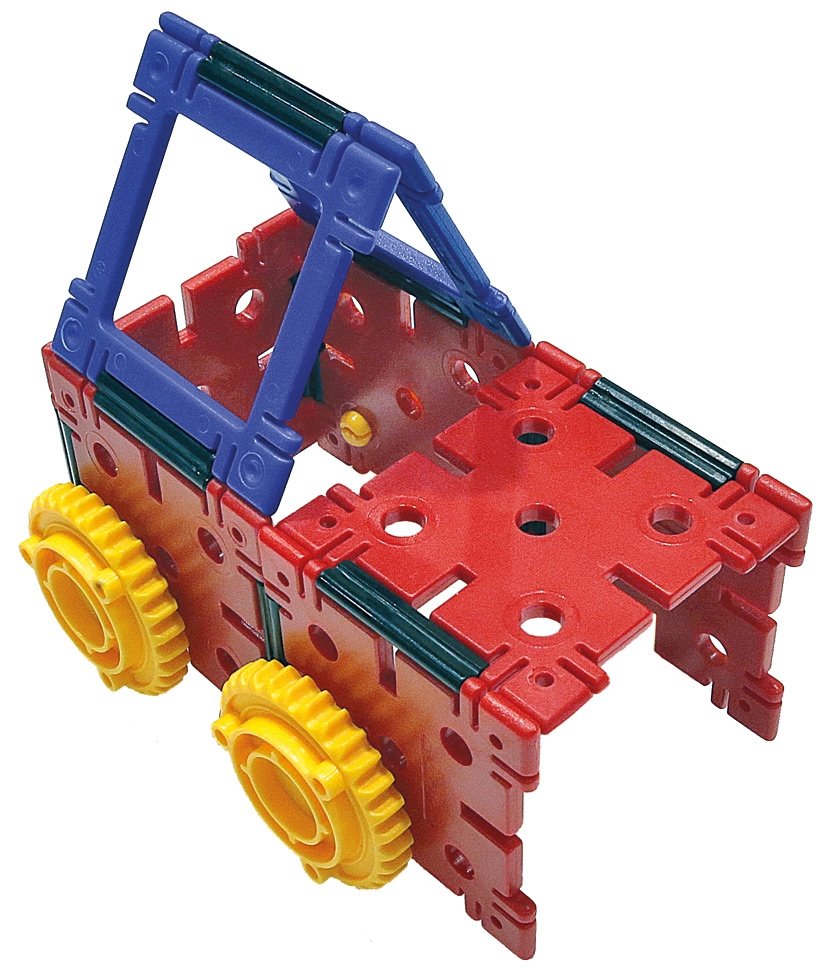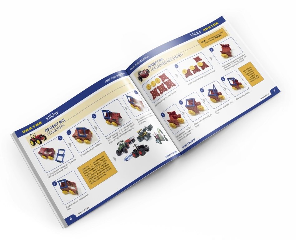 В набор входит 21 элемент (квадраты, колесики), из деталей можно собрать 12 простых конструкций — машинки, домики и пр. В сборке поможет подробная иллюстрированная инструкция.