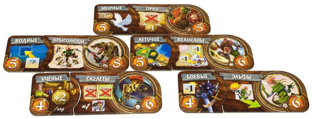 - 18 жетонов забытых племён, 10 тролльих пещер, 6 крепостей, 9 гор, 5 лагерей, 2 норы, 2 героя и 1 дракон.