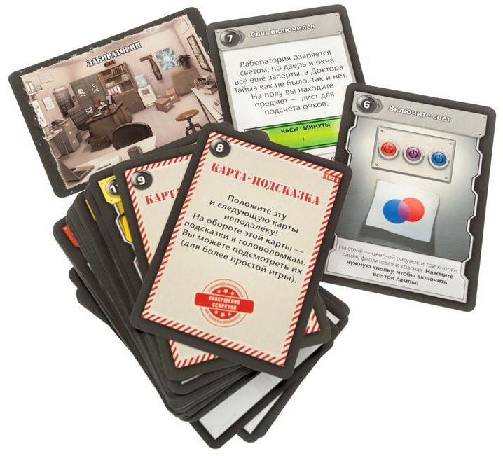 Осторожно, двери... уже закрылись! Теперь вы заперты в таинственной лаборатории Доктора Тайма. Вас окутывает кромешная тьма и лишь три кнопки светятся на стене... Кажется, это хитроумная головоломка - первая из множества разнообразных загадок, ответы на которые вам предстоит найти в этом настольном квесте.