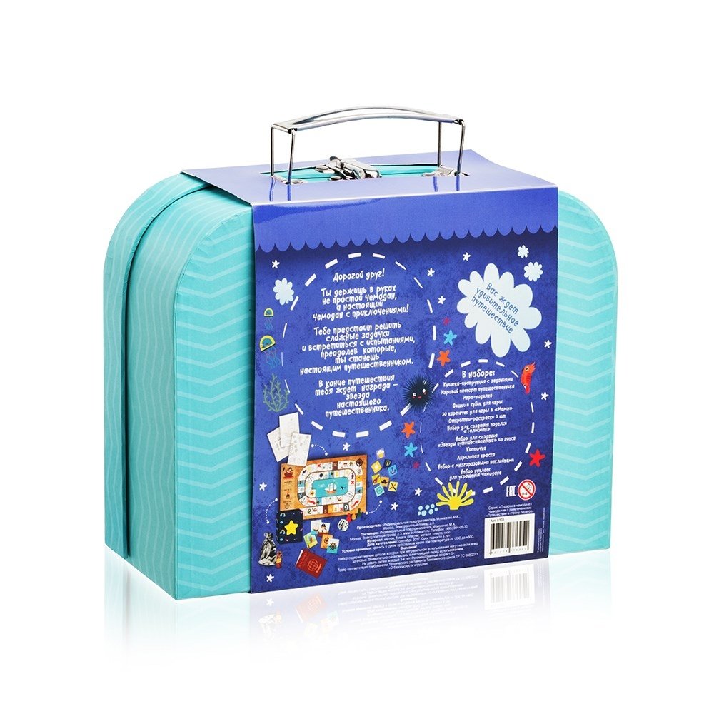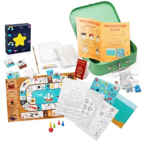 В комплекте: книжка-инструкция с заданиями, паспорт путешественника, игра-ходилка, фишки и кубик для игры, 30 карточек для игры в «Мемо», открытки-раскраски 3 шт., набор для создания поделки «Талисман», набор для создания «Звезды путешественника» из гипса, кисточка, акриловая краска, набор с многоразовыми наклейками, набор наклеек для украшения чемодана.