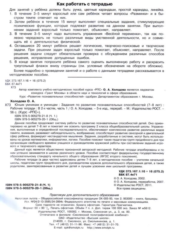 Данное пособие продолжает систему работы по развитию познавательных способностей детей. Оно ориентировано на детей 7–8 лет и помогает им освоить программу 2 класса общеобразовательной школы. Упражнения, выполненные в определённой последовательности, обеспечивают комплексное развитие различных видов памяти, внимания, развивают наблюдательность, воображение; способствуют развитию сенсорной и двигательной сфер ребёнка, формируют нестандартное мышление. Задания, разработанные в системе, могут быть использованы на уроках математики, информатики, логики. Пособие поможет также педагогам групп продлённого дня при организации свободного времени учащихся и руководителям кружковой работы при составлении заданий игрового и творческого характера. В пособии использована авторская система, разработанная кандидатом педагогических наук Н.К. Винокуровой. Рабочие тетради апробированы и успешно применяются в школах различного уровня. Рабочие тетради (в двух частях) адресованы детям 7-8 лет, а методическое пособие - их родителям и учителям начальной школы, педагогам групп продлённого дня, педагогам дополнительного образования младших школьников, а также всем, кто заинтересован в развитии детей и лучшего усвоения ими школьной программы.