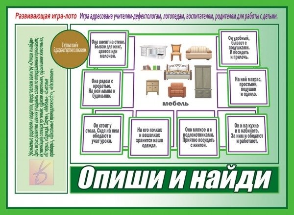 Настольная дидактическая игра-лото «Опиши и найди» Цель: развитие умения угадывать слово по определенным признакам, активизация словарного запаса по темам: «Дикие животные», «Домашние животные», «Птицы», «Одежда. Обувь», «Мебель», «Бытовые приборы», «Школьные принадлежности», «Насекомые». Игра прекрасно развивает память, логику и ассоциативное мышление.