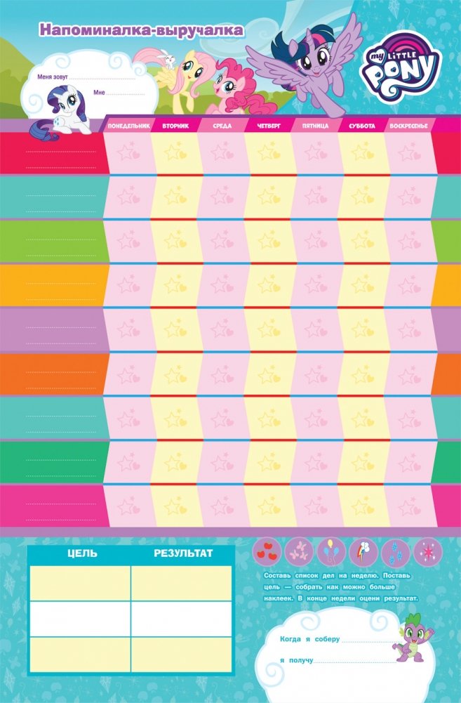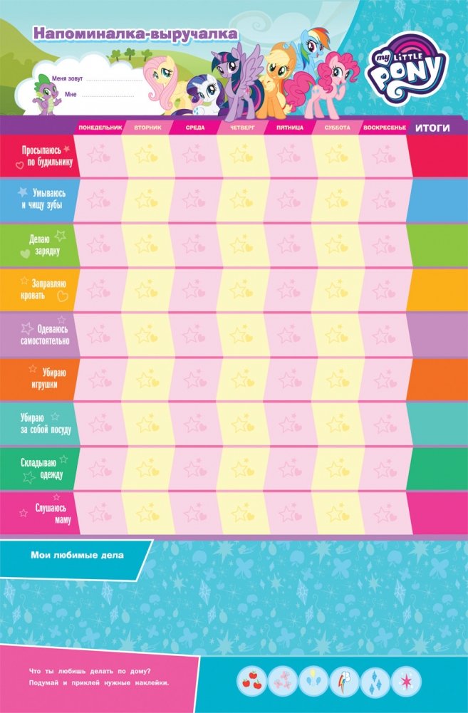 Кто проснулся по будильнику, умылся и почистил зубы, сделал зарядку и заправил кроватку? Кто слушается маму и убирает игрушки? Этот веселый и красочный плакат-мотиватор с изображениями милых пони из мультсериала «Дружба - это чудо» поможет ребенку запомнить список повседневных дел и приучиться к порядку и самостоятельности, а мамам и папам - вовремя поощрять и хвалить ребенка за маленькие, но такие важные ежедневные достижения. В комплект входит лист многоразовых наклеек с мотивирующими надписями, а также приятный сюрприз - наклейки с изображениями героинь любимого мультфильма.