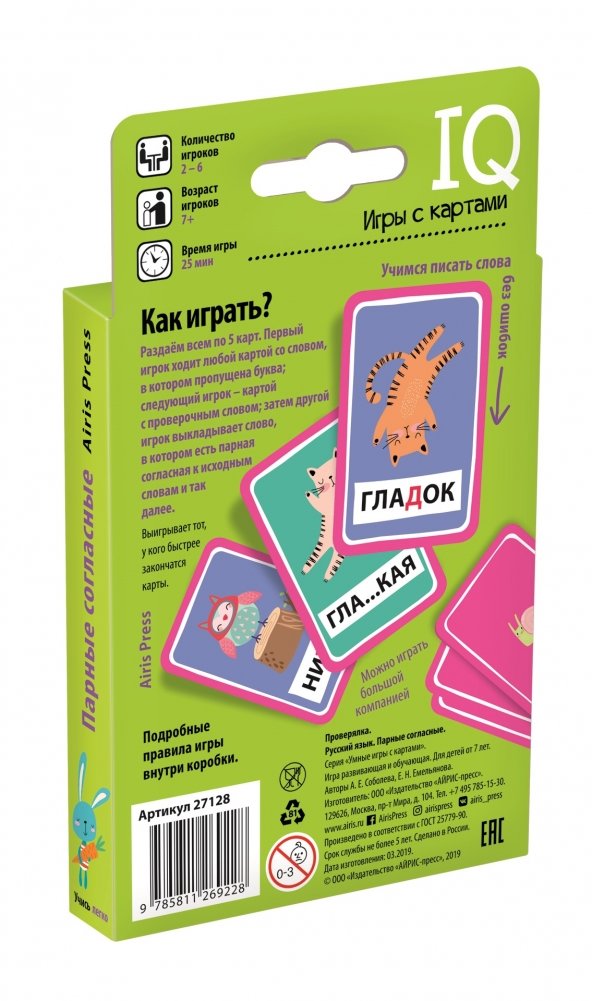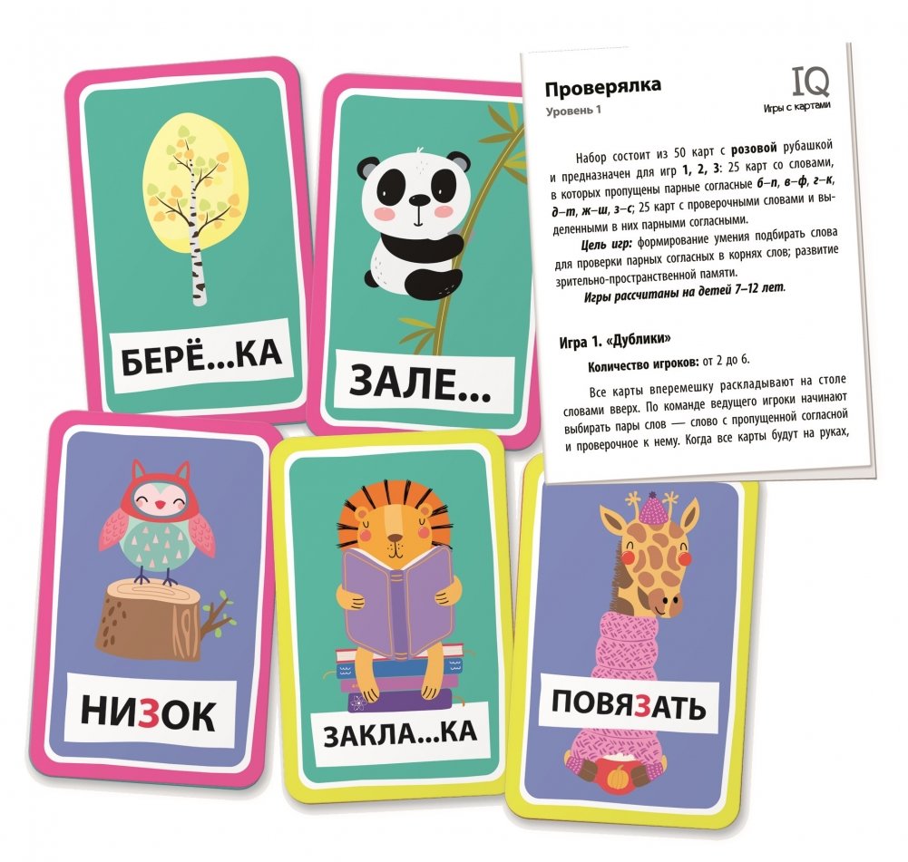 В наборе две колоды: 50 карт с проверяемыми словами; 50 карт с однокоренными проверочными словами. На одних картах в словах пропущены парные согласные, на других они выделены. Яркие картинки делают игры ещё увлекательнее. В каждой коробке есть подробная инструкция и описание игр, но на первом этапе детям может понадобиться помощь взрослых.