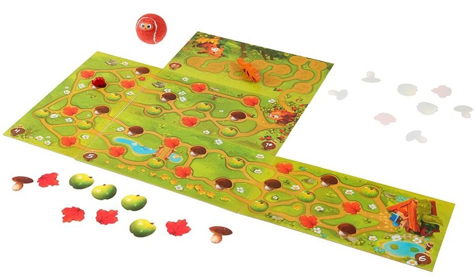 Соревнуйтесь с друзьями в ежиной перекати-гонке: бросайте мохнатый мячик на жетоны-липучки и собирайте яблочки, листочки и грибочки, чтобы продвинуться по лесной тропинке к домику ежа.