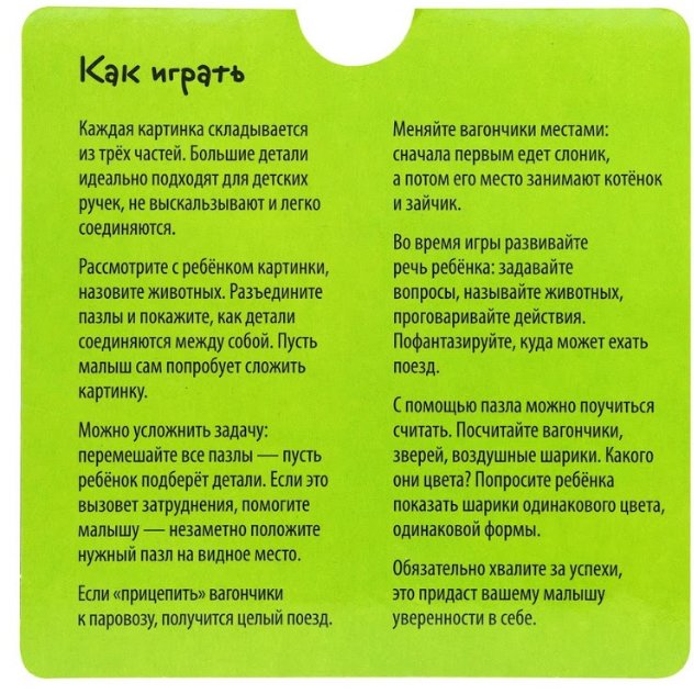 Пазлы «Паровозик» – это увлекательная настольная игра для развития восприятия, мелкой моторики, умения соотносить часть и целое. В наборе 6 пазлов с цветными картинками. Цель игры - правильно сложить из трёх частей каждую картинку-пазл.