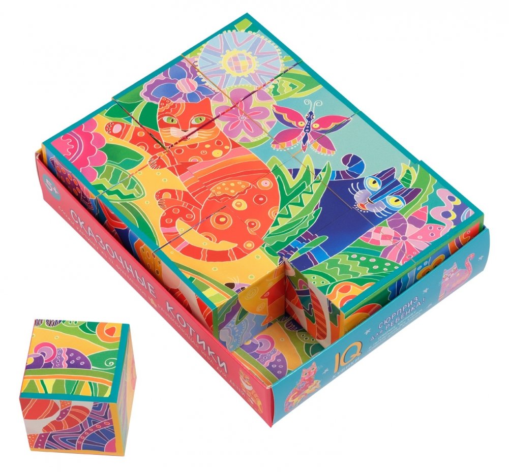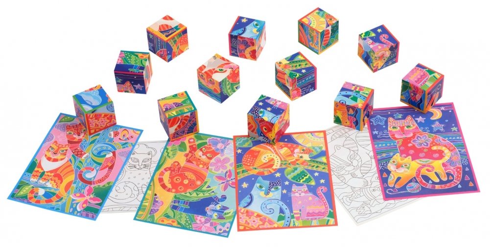 В наборе есть 6 картинок-раскрасок со сказочными котами. А ещё маленькое чудо в подарок. Сложите картинку и переверните все кубики. Смотрите на новую картинку!
