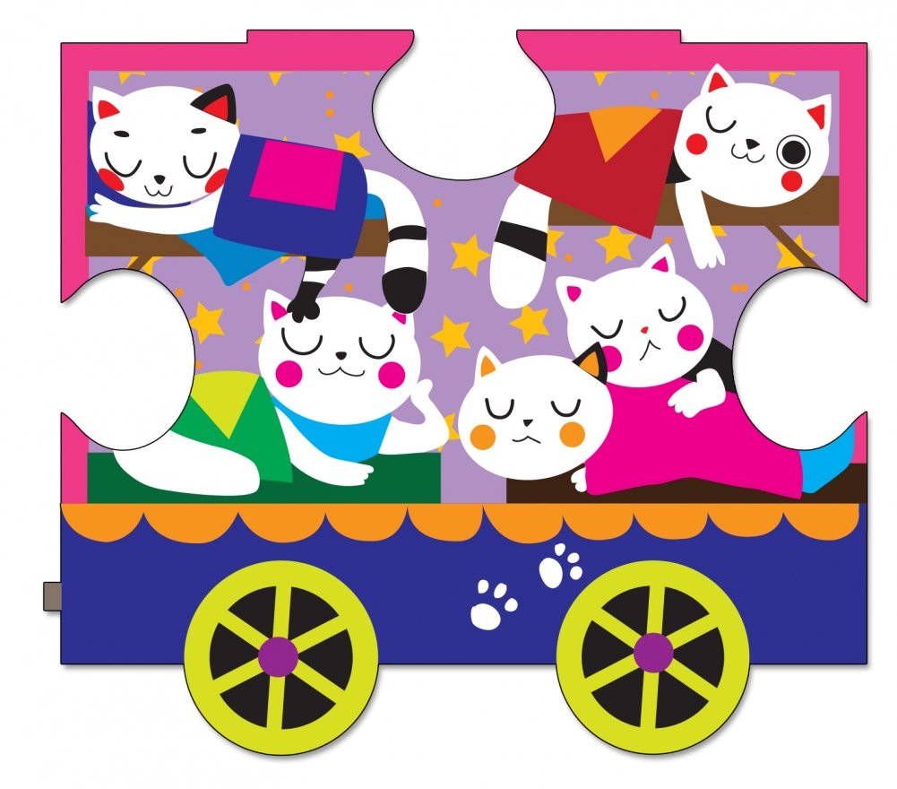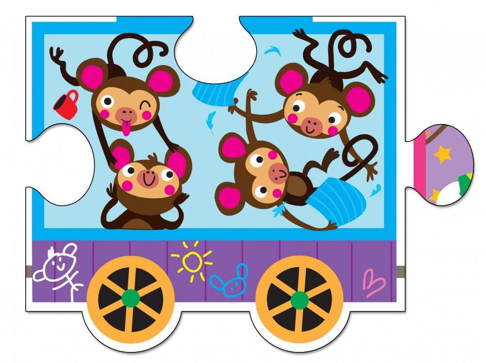 Играть в эту игру очень просто. Сначала найдите паровозик. В нем едет один машинист – лев. Найдите пазл с цифрой 1 и сложите вместе эти пазлы. Посчитайте с малышом, сколько пассажиров едет в каждом вагончике. Потом найдите соответствующую цифру и сложите пазлы. У вас получится целый состав, длинной почти в 2 метра (187 см)!