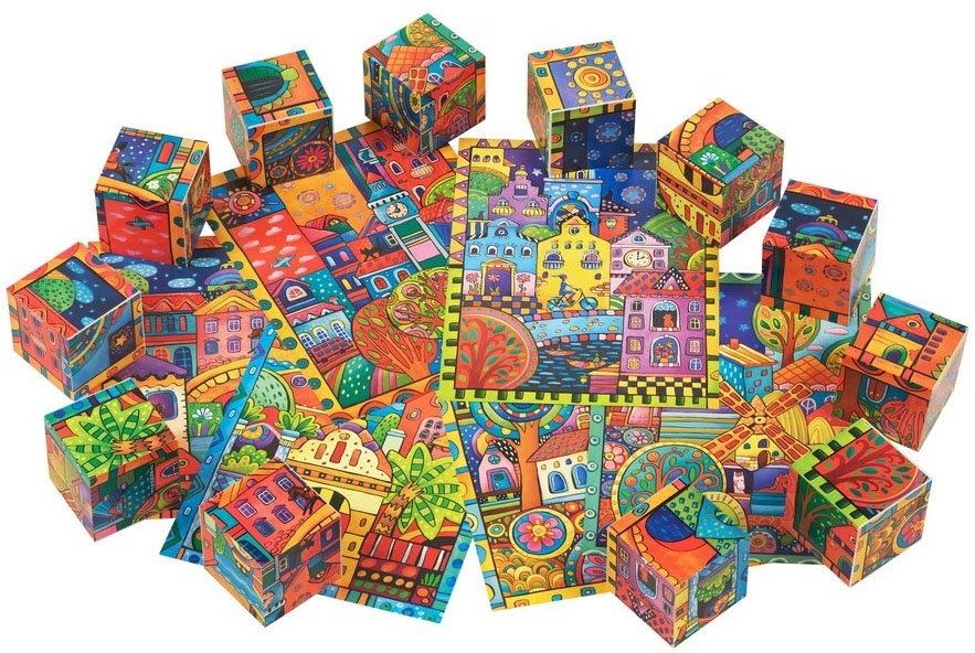 Набор состоит из 12 кубиков размером 4х4 см. Ребёнку нужно сложить картинку из 12 фрагментов. В качестве подсказки даны 6 картинок с изображением разноцветных домиков. Картинка кладётся на дно коробочки, и ребёнок ставит на неё нужные кубики. На обороте картинок даны контурные рисунки для раскрашивания. Во время игры происходит знакомство с понятиями "часть и целое", развивается умение работать по образцу. Наклейки на кубики сделаны из качественной гладкой бумаги, которая не портится от игры.
