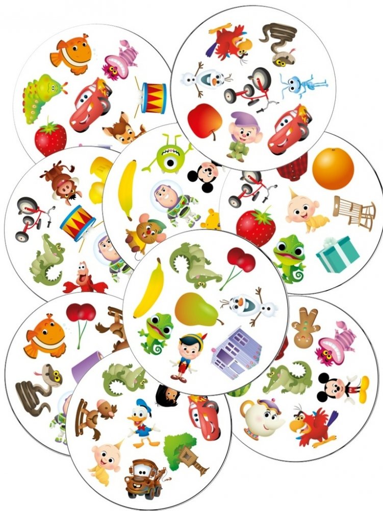 В наборе 55 карточек (диаметр 100 мм) и развивающая книжка с заданиями, 5 вариантов правил для игры, от 2 до 8 участников. Возраст 3+, каждая коробочка имеет подвес. В любой паре карточек только один из восьми рисунков совпадает найди его как можно скорее! Это игра не только для развлечения, но и для развития внимания, наблюдательности и памяти!