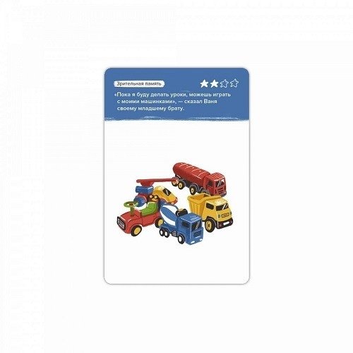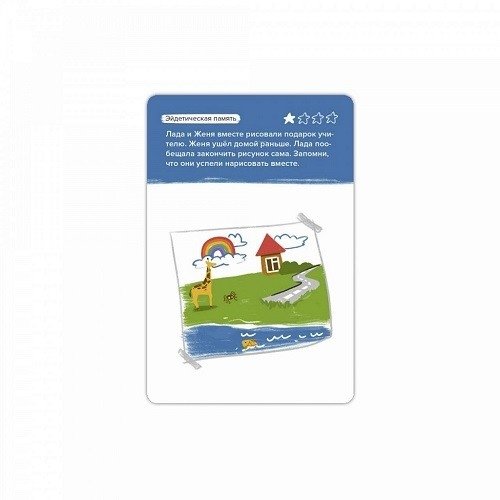 Память детей — сложный механизм. Слышали детскую фразу "В одно ухо влетело, из другого вылетело"? Любой родитель хотел бы, чтобы к их ребенку это не относилось и вследствие этого возникает вопрос: как развить детскую память? В этом ребенку поможет игра "Развитие памяти". В наборе 11 карт с описанием мнемотехник и 69 карт с заданиями разной сложности.