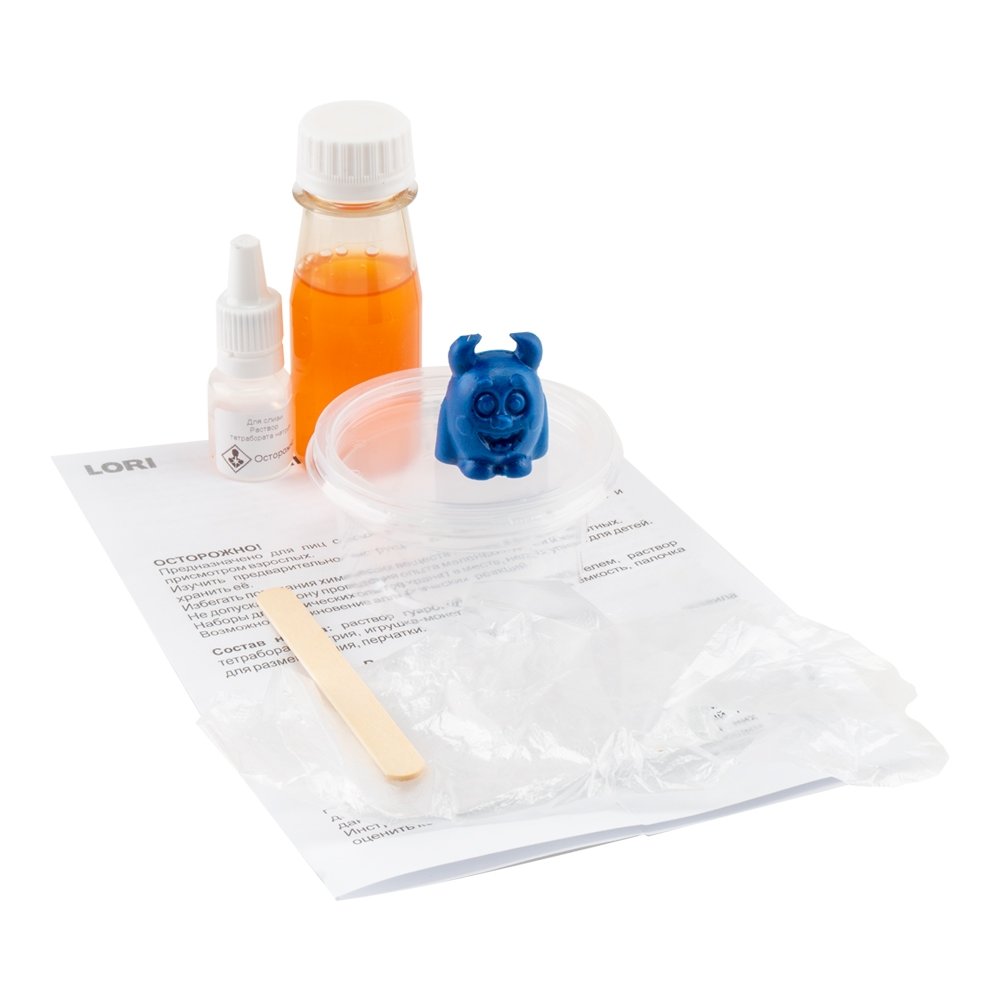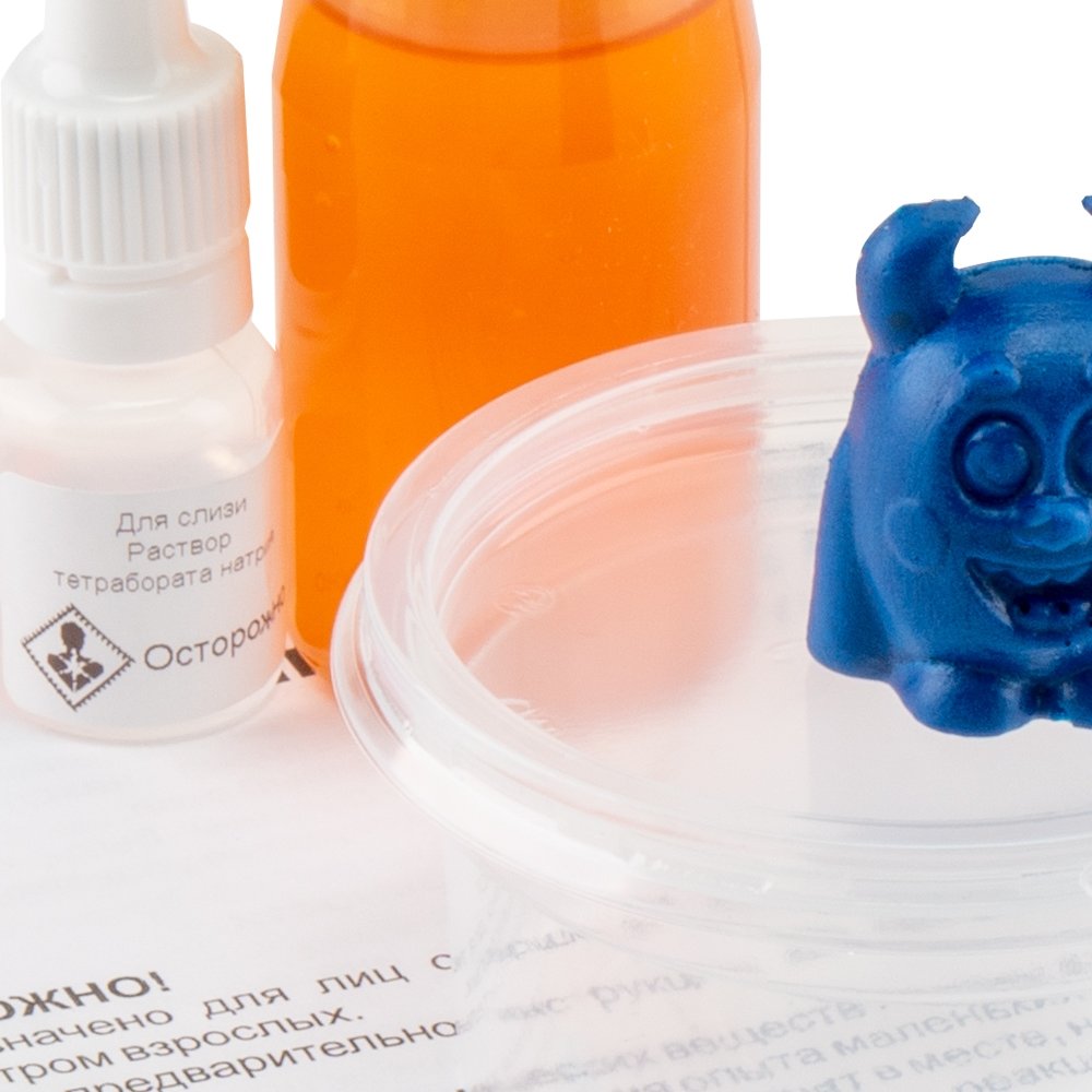В комплекте: раствор гуаровой камеди с красителем, раствор тетробората натрия, пластиковая емкость, игрушка-монстрик, палочка для размешивания, перчатки, инструкция.