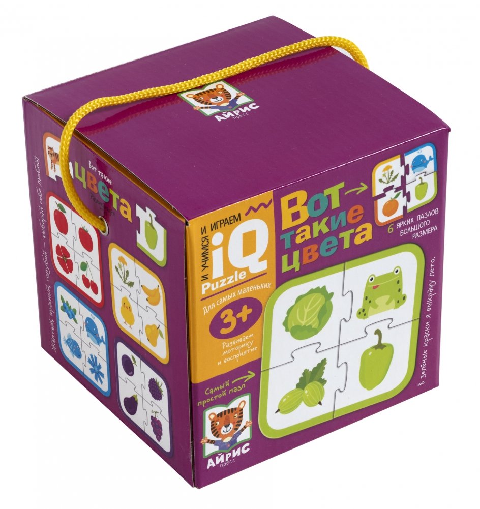 Пазлы «Вот такие цвета» – это увлекательная настольная игра, которая поможет ребёнку запомнить шесть основных цветов: красный, жёлтый, зелёный, синий, оранжевый и фиолетовый. Задача - сложить шесть пазлов разного цвета. Каждый пазл состоит из четырёх картинок, на которых изображены животные и растения. Более сложный вариант игры: собрать с ребёнком тематические пазлы – с животными, овощами, фруктами, ягодами и цветами.