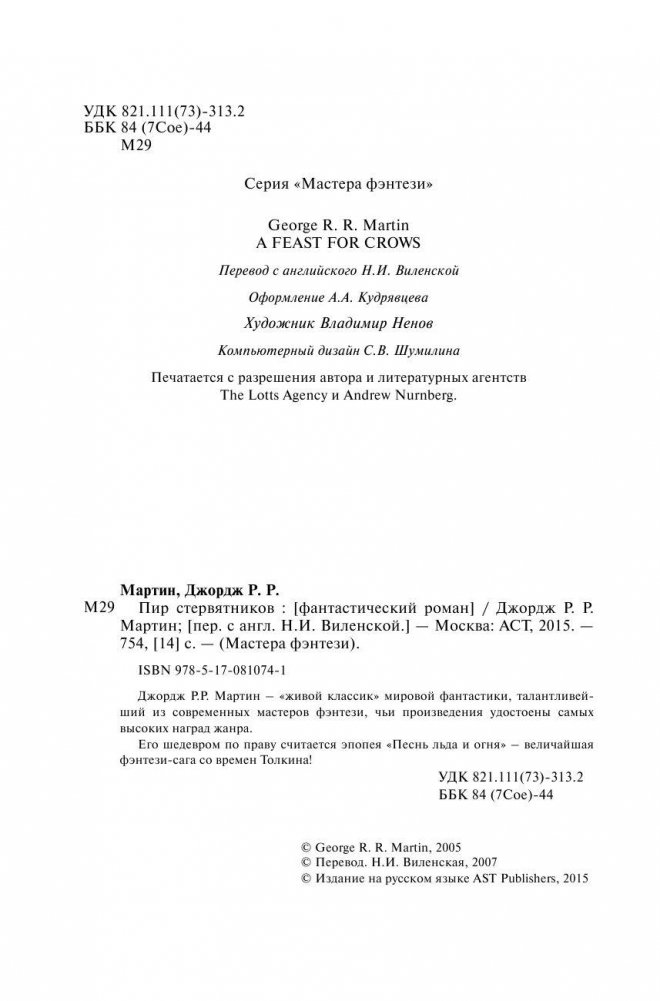 В нашей стране, в США, в Европе, даже в Японии - по всему миру первоклассное современное фэнтези связывают именно с Джорджем Мартином. Джордж Мартин - «живой классик» мировой фантастики, талантливейший из современных мастеров фэнтези, чьи произведения удостоены самых высоких наград жанра. Его шедевром по праву считается эпопея «Песнь льда и огня» - величайшая фэнтези-сага со времен Толкина! Перед вами - «Пир стервятников», четвёртая летопись цикла.