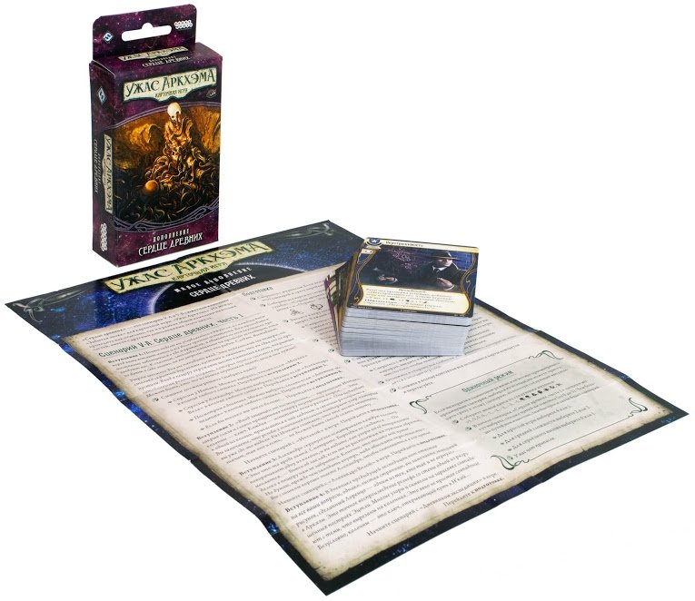 "Сердце древних" – малое дополнение (60 карт), составляющее пятый сценарий (в двух частях) сюжетной кампании "Забытая эпоха". Внутри коробки вы найдёте новые карты игроков для развития и улучшения ваших колод, а также новые сценарии. Их можно пройти как в одиночном режиме, так и в рамках кампании "Забытая эпоха". В набор входят карты 192–228 кампании "Забытая эпоха" и лист сценариев.