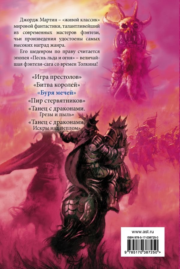 Джордж Мартин. Писатель, очень рано и легко добившийся огромного успеха. Начиная с рассказов и повестей, представлявших собой смелую смесь научной фантастики и «ужасов» (за произведения в этом жанре удостоен двух «Хьюго» и двух «Небьюла»), работал и в «классической» научной фантастике, но впоследствии стал подлинным мастером фэнтези, которого критики ставят наравне с Д.Р.Р.Толкином и Р.Джорданом. Перед вами - знаменитая эпопея «Песнь льда и огня». Эпическая, чеканная сага о мире Семи Королевств. О мире суровых земель вечного холода и радостных земель вечного лета. О мире опасных приключений, тончайших политических интриг и великих деяний. О мире лордов и героев, драконов, воинов и магов, чернокнижников и убийц - всех, кого свела Судьба во исполнение пророчества...