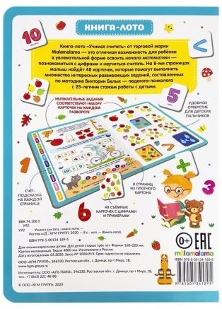 Книга-лото "Учимся считать"- это развивающее пособие для детей, которое разработано по методике Виктории Белых - педагога-психолога с 25-летним стажем работы с детьми. Занятия по этому пособию гарантируют максимальный прогресс в развитии вашего малыша. В книге 8 страниц с увлекательными заданиями и 48 плотных съёмных карточек с удобным отверстием для детских пальчиков. Под каждой карточкой спрятана картинка, которая играет ключевую роль в выполнении заданий.