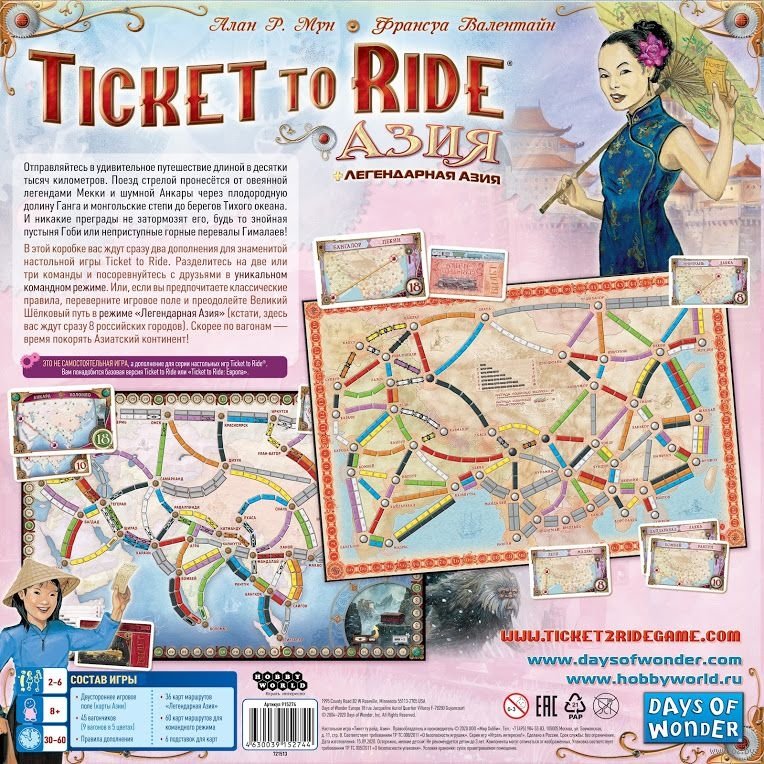 Покорите гордый Азиатский континент в одиночку или в команде с другом! В коробке "Ticket to Ride. Азия" лежат сразу два дополнения для оригинальной игры.