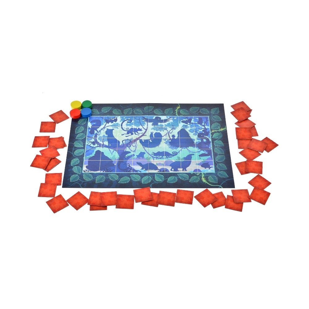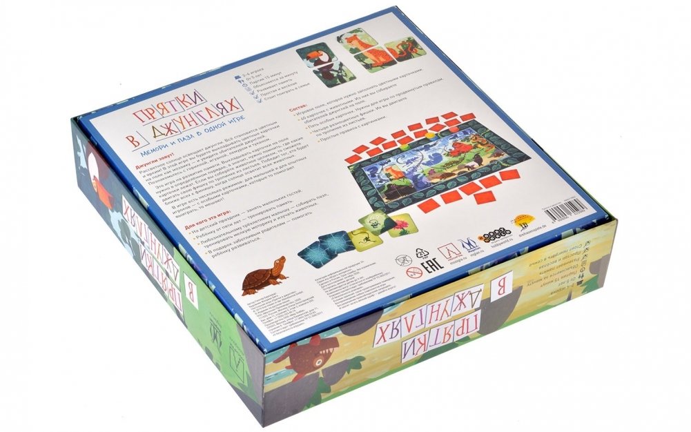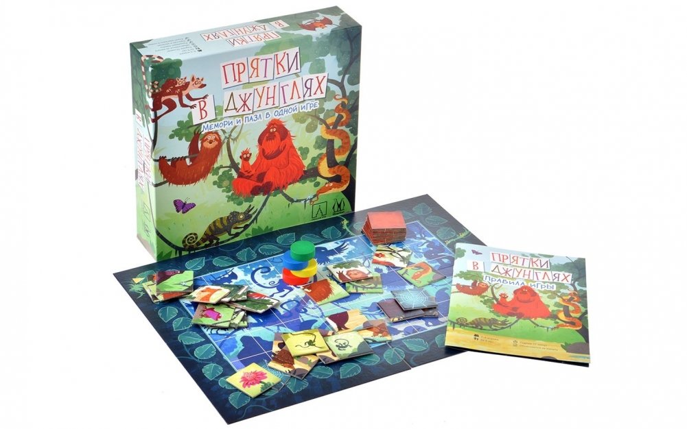 Вперёд, в джунгли! Над тропическими лесами восходит солнце и раскрашивает его обитателей яркими красками. В ходе игры в "Прятки в джунглях" вам предстоит раскладывать карточки в определённом порядке, как детали мозаики – и собирать из них разнообразных ярких обитателей джунглей, таких как тукан, горилла или лемур. Но выкладывать карточки нужно строго по правилам, держа их в уме – а значит, в ходе игры маленькие игроки будут развивать свою память. Собрав животное целиком, вы сможете передвинуть свою фишку на какое-либо количество клеток вперёд, и тот, кто продвинется дальше всех – побеждает. Правилами предусмотрено несколько уровней сложности, так что интересно играть будет не только самым маленьким, но и более старшим и опытным настольщикам.