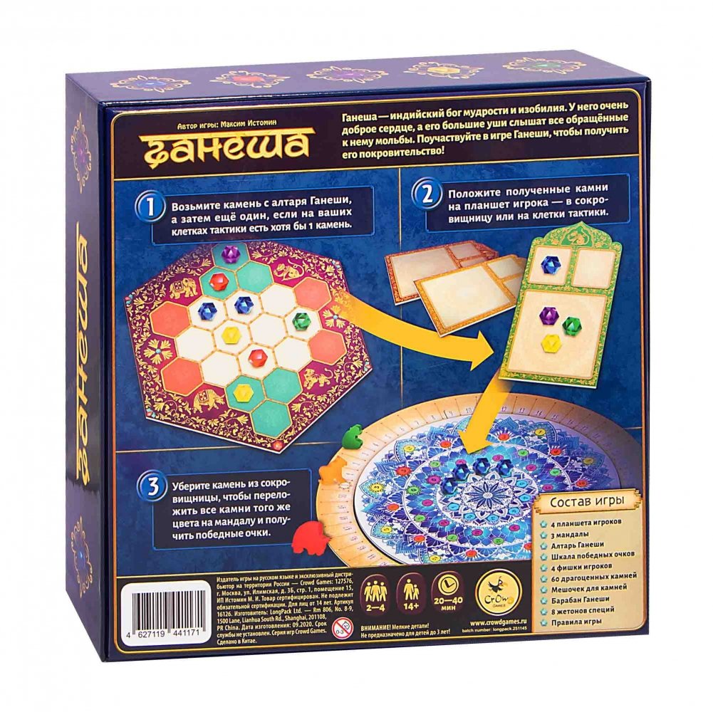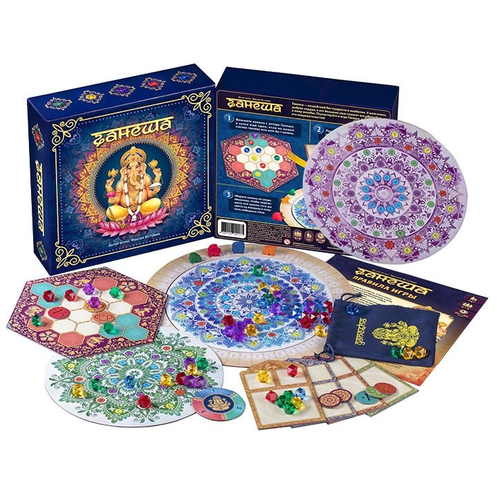 Увлекательная игра для семейного вечера или встречи с друзьями, в которой вам предстоит собирать драгоценные камни с алтаря Ганеши, размещать их на своём планшете, а затем решать, выкладывать их на мандалу сразу, чтобы раньше других получить победные очки, или же немного выждать, чтобы, возможно, набрать ещё больше очков!