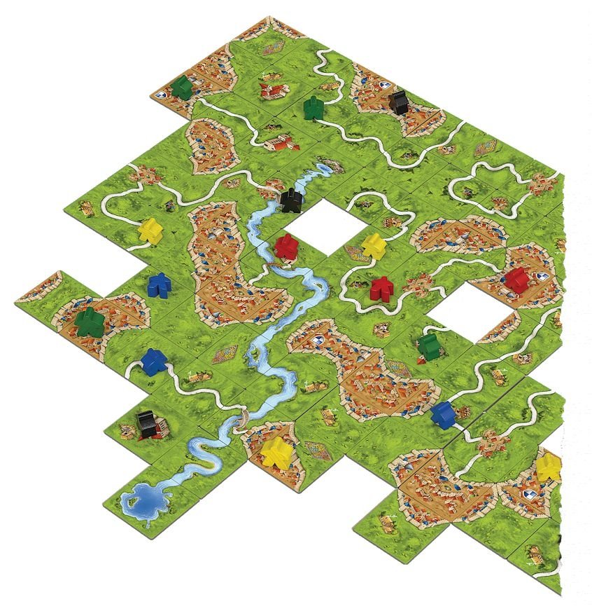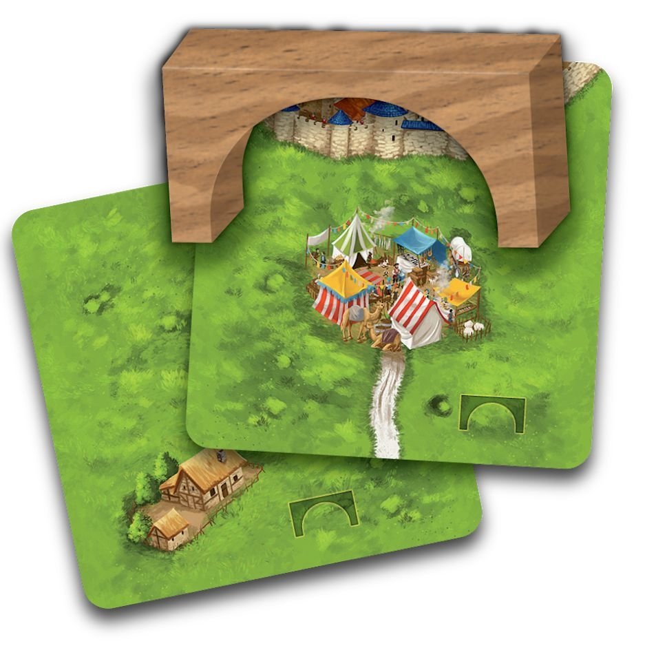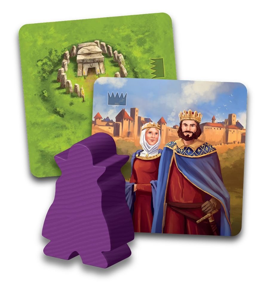 Комплектация: 124 квадрата местности, 24 квадрата с рекой, 2 планшета крепости Каркассон, квадрат рыцаря-разбойника, квадрат короля, 12 фишек мостов, 40 фишек подданных, 5 фишек аббатов. фишка графа, фишка дракона, фишка феи, 2 жетона рыцаря-разбойника, 12 жетонов замков, 2 жетона короля дорожка подсчёта очков, правила игры.
