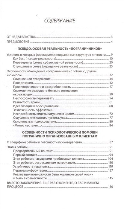 По мнению автора, у каждого из нас есть пограничные способы реагирования, но у кого-то они глубоко запрятаны, а для кого-то стрессом является жизнь как таковая, и потому эти способы превращаются в "пограничную организацию личности". Психиатры и психоаналитики помещают "пограничников" между невротиками (условно психически здоровыми людьми) и психотиками (психически нездоровыми). Задача автора - понять качественные особенности структуры психики таких людей. Как и во всех изданиях этой серии, первая часть книги посвящена феноменологии: анализу условий, в которых формируются такие особенности психики, способов обхождения "пограничника" с собой, с окружающими, с миром (правда, в отличие от предыдущих книг серии, уже не в форме художественного произведения). Во второй части описаны особенности психотерапевтической помощи таким клиентам.